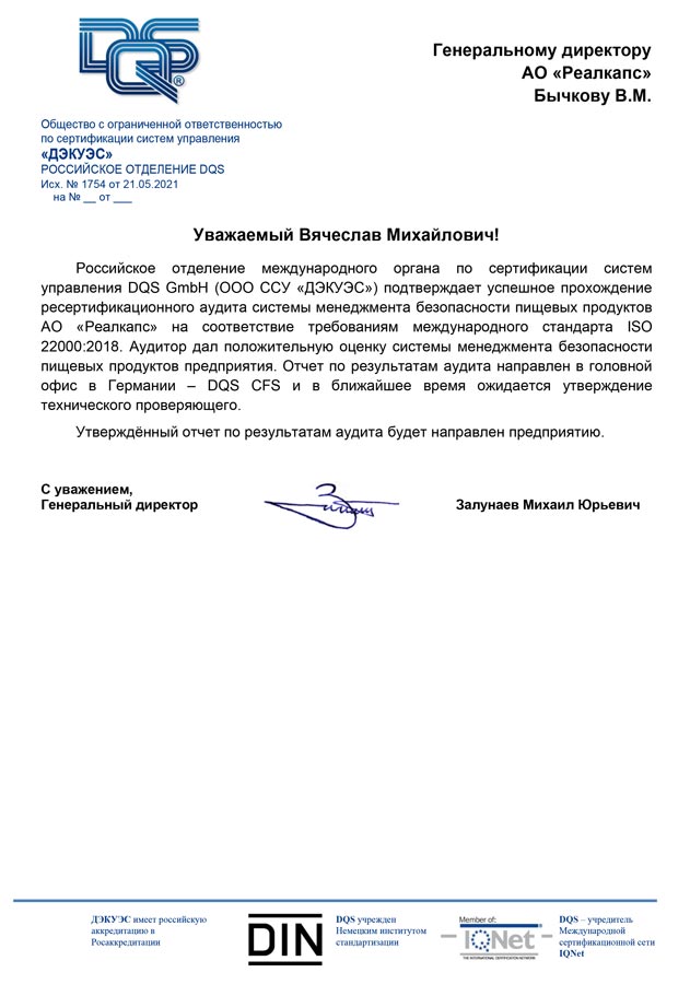 В апреле 2018 года наша компания успешно прошла сертификационный аудит на соответствие требованиям международного стандарта ISO 22000 в международном органе по сертификации DQS.