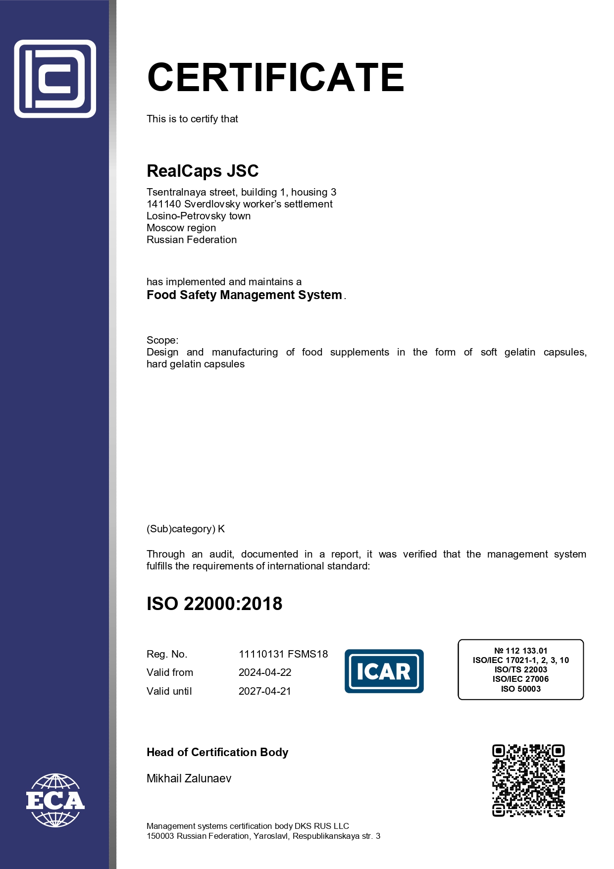 Соответствие системы менеджмента безопасности пищевых продуктов ISO 22000:2018 подтверждено сертификатом соответствия.