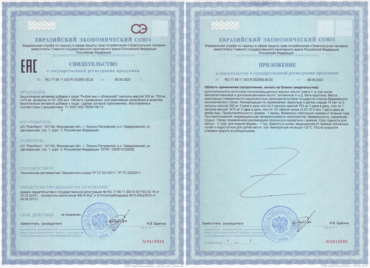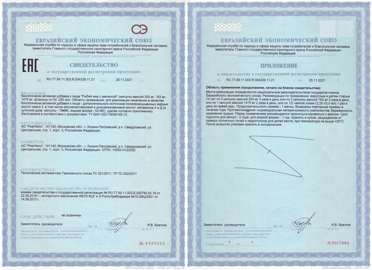 БАД к пище «Рыбий жир очищенный» зарегистрирована Федеральной службой по надзору в сфере защиты прав потребителей и благополучия человека. Свидетельство о государственной регистрации № RU.77.99.11.003.R.003715.10.19 от 08.10.2019 года, ТУ 9281-023-78056148-13 с изменениями №1, №2.
