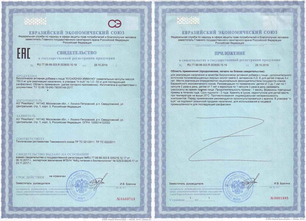 БАД к пище «КУСАЛОЧКА IQ Омега-3» зарегистрирована Федеральной службой по надзору в сфере защиты прав потребителей и благополучия человека. Свидетельство о государственной регистрации № AM.01.01.01.003.R.000610.08.23 от 29.08.2023 года, ТУ 10.89.19-064-78056148-2023.