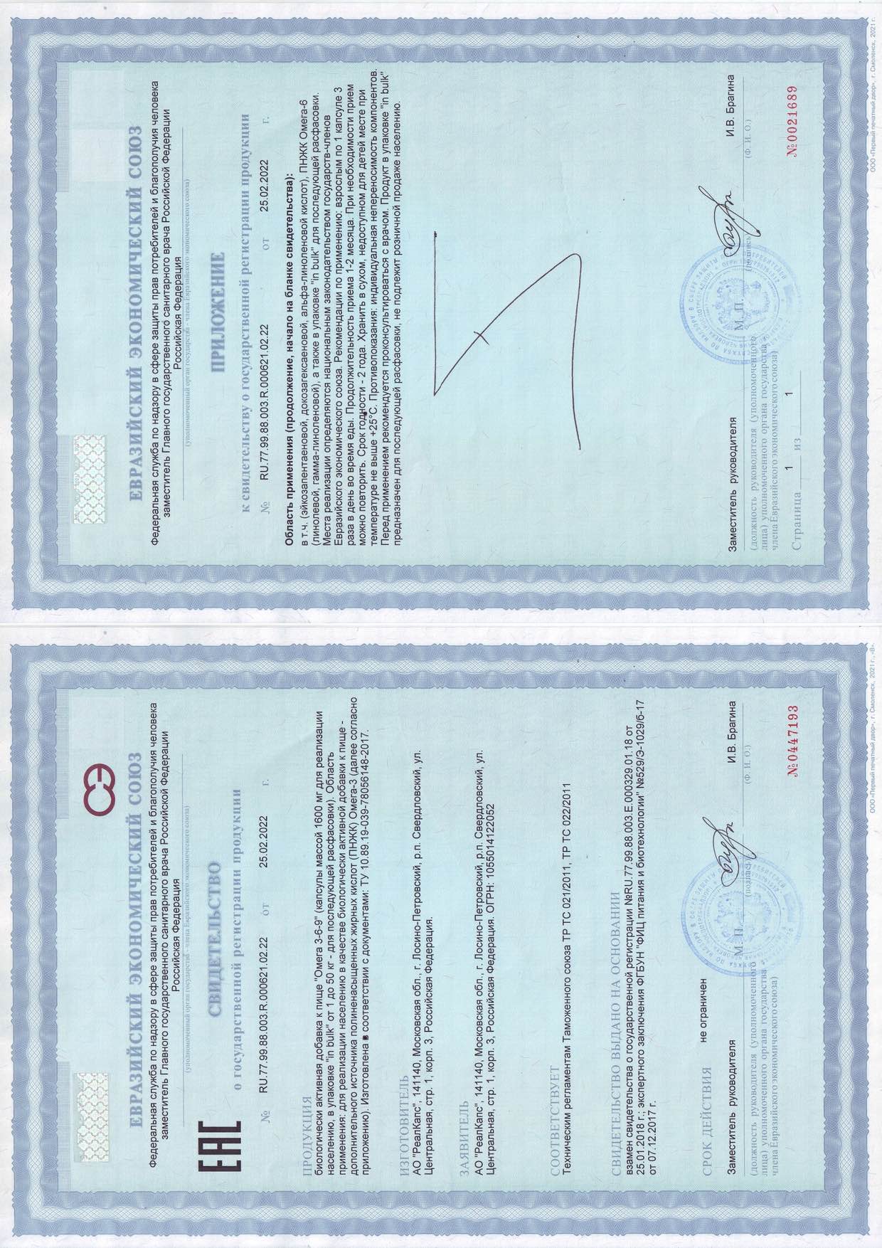 «Омега 3-6-9» зарегистрирован Федеральной службой по надзору в сфере защиты прав потребителей и благополучия человека. Свидетельство о государственной регистрации № RU.77.99.88.003.R.000621.02.22 от 25.02.2022 г. ТУ 10.89.19-039-78056148-2017