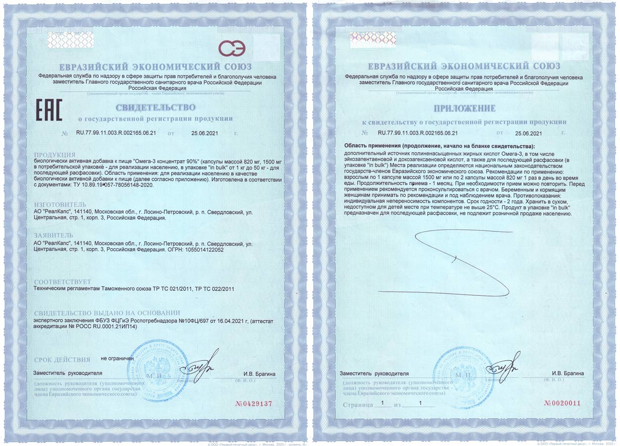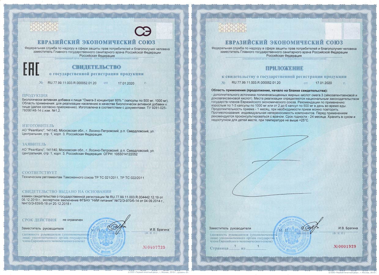 «Омега-3 концентрат 60%» зарегистрирован Федеральной службой по надзору в сфере защиты прав потребителей и благополучия человека. Свидетельство о государственной регистрации № RU.77.99.11.003.R.000052.01.20 от 17.02.2020, ТУ 9281-025-78056148-14 с изм. №1, №2.