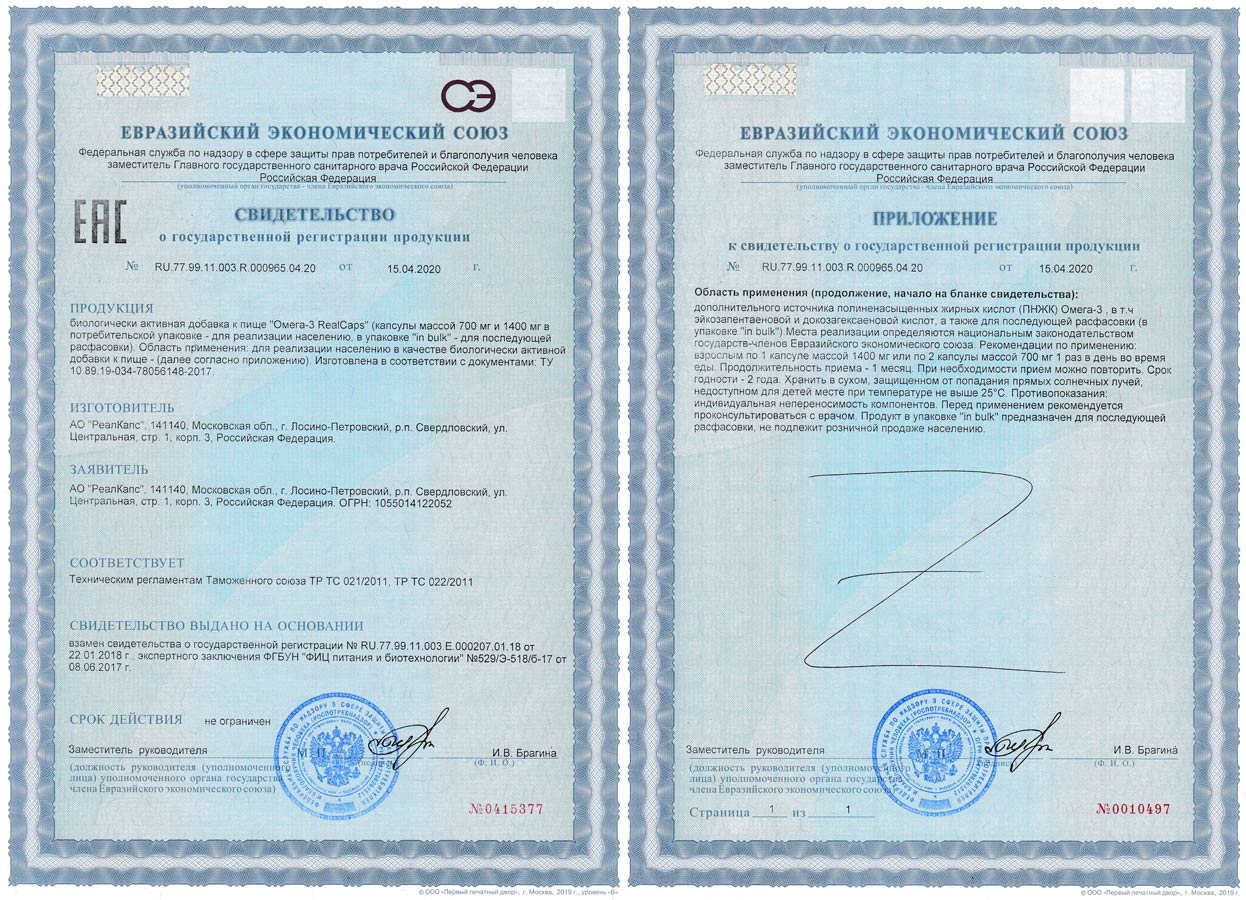 БАД к пище «Омега-3 RealCaps» зарегистрирован Федеральной службой по надзору в сфере защиты прав потребителей и благополучия человека. Свидетельство о государственной регистрации № RU.77.99.11.003.E.000207.01.18 от 22.01.2018 года, ТУ 10.89.19-034-78056148-2017.